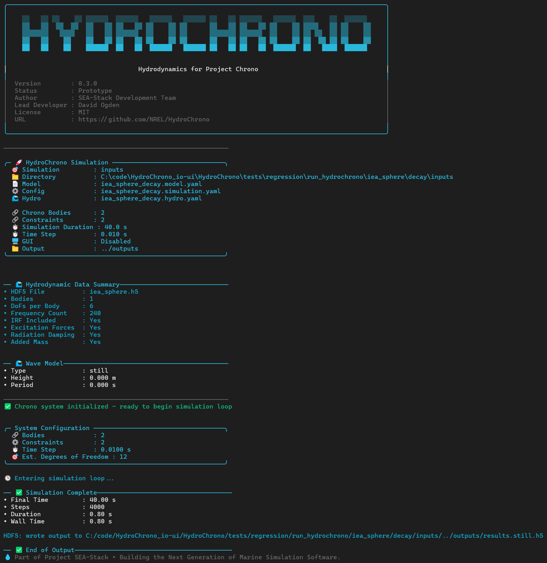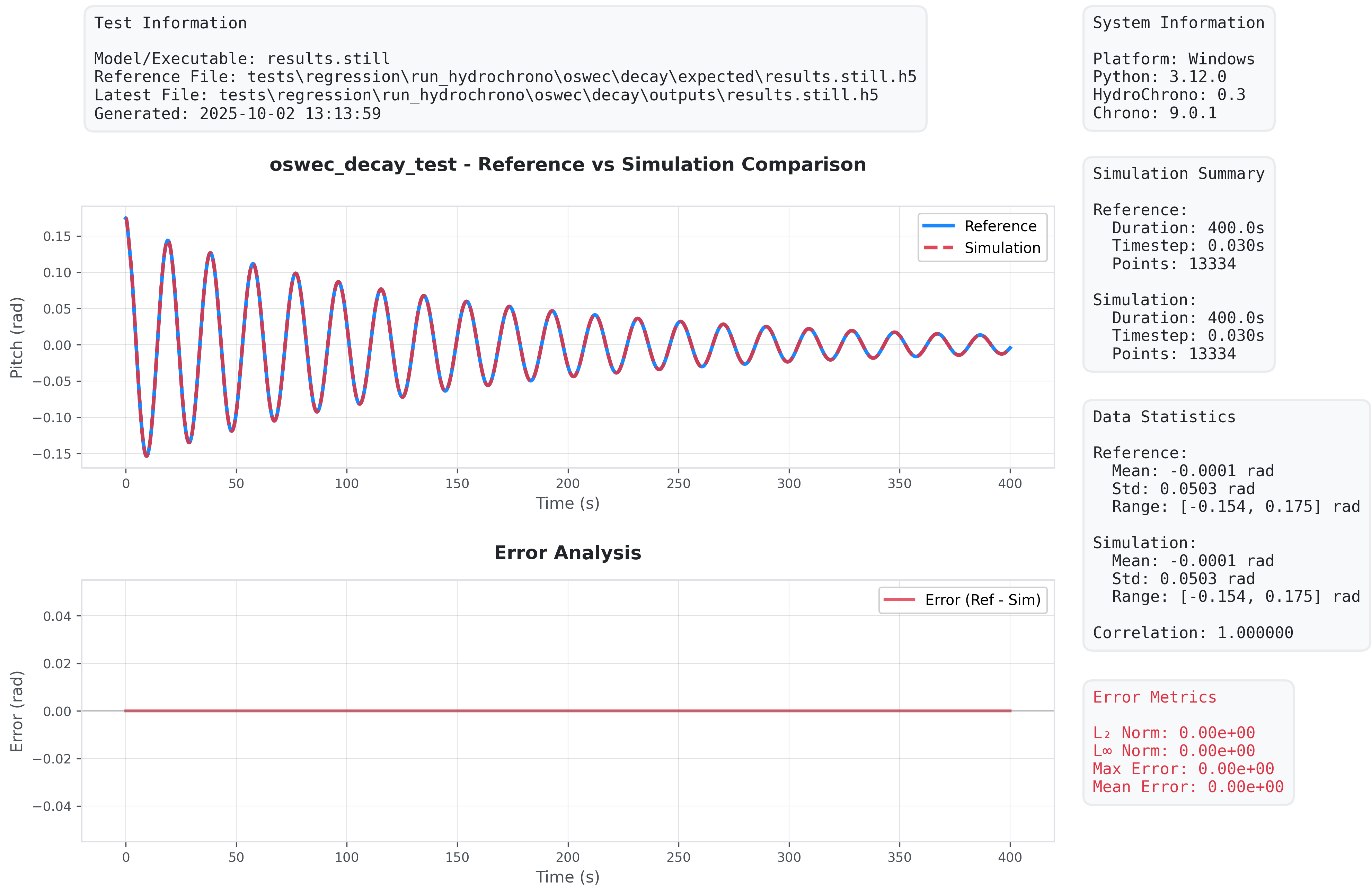 HydroChrono (Hydrodynamics for Project Chrono) is a hydrodynamics simulation toolkit built on Project Chrono. It is designed for simulating wave energy converters (WECs) and other complex ocean systems, and is 100% free and open‑source end‑to‑end — no proprietary dependencies required.