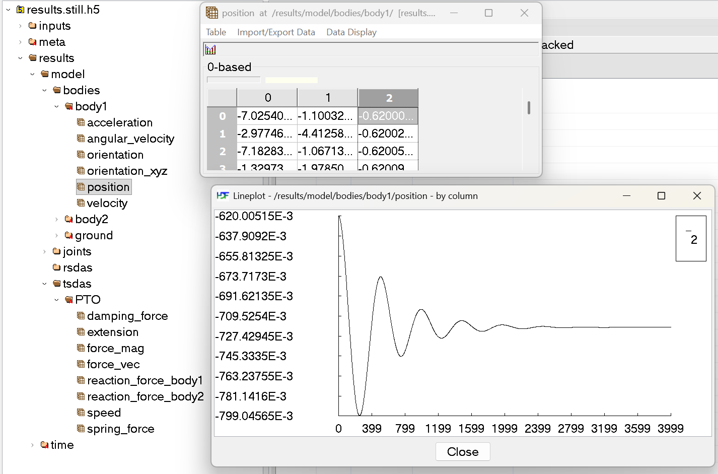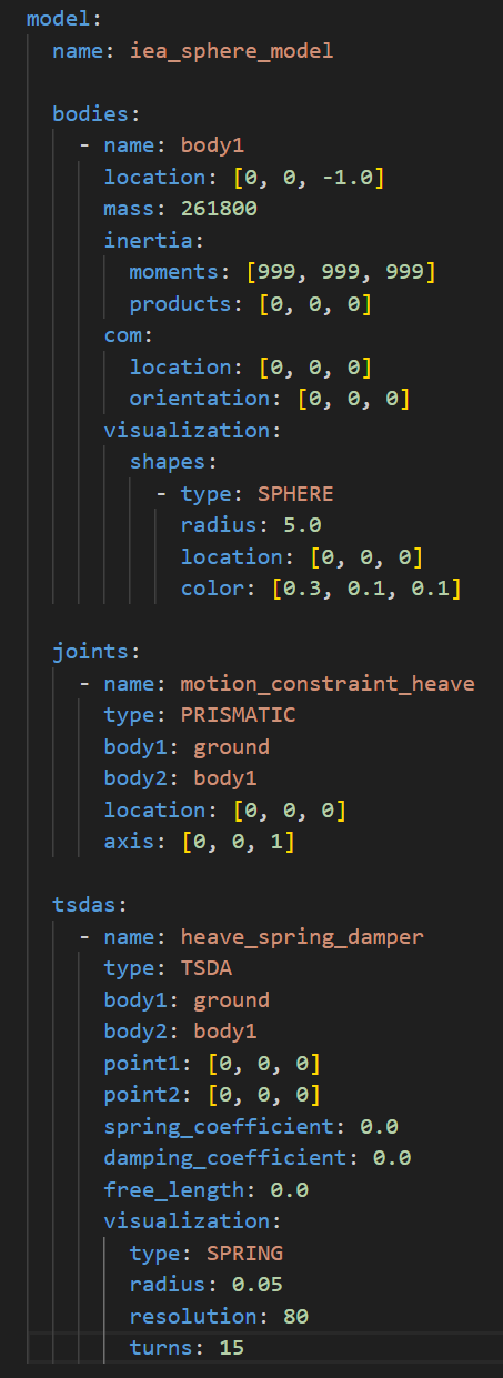 my_model.setup.yaml— orchestrates which inputs to runmy_model.model.yaml— Chrono multibody system (bodies, joints, constraints, actuators)my_model.simulation.yaml— time step, duration, output options, GUI flagsmy_model.hydro.yaml— BEMIO.h5path and hydrodynamics mapping/wave inputs